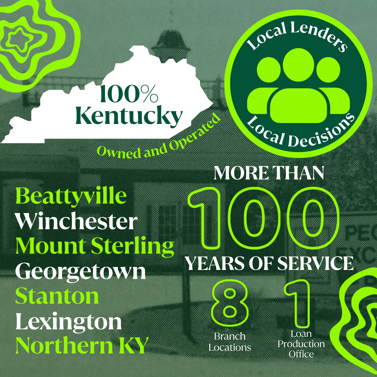Our history is the story of people- people with roots deep in the history of their community and with a strong feeling of responsibility towards its growth and success. Their knowledge and experience have contributed to what is one of the most stable banks in the Commonwealth of Kentucky still today. We have endured and progressed with the changing times and have responded to various economic and banking policies, ever mindful of the welfare of the community, employees and customers we serve.